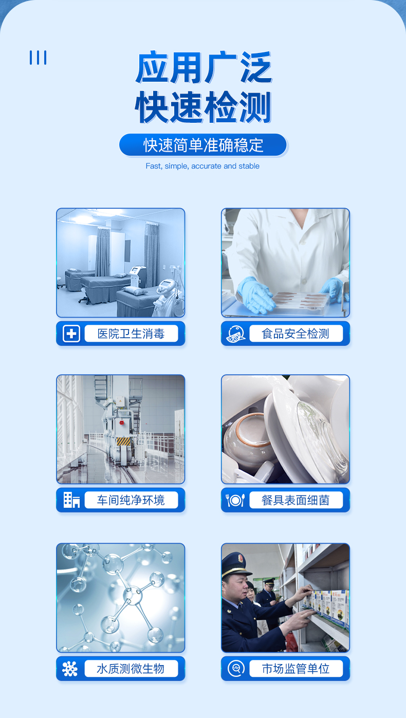 潔凈度檢測設備廣泛應用于:細菌微生物檢測、醫藥衛生、食品安全、市場執法、表面潔凈度檢測、醫療防疫、水質水政、生產線衛生、··· 熱線:133-7109-8225
