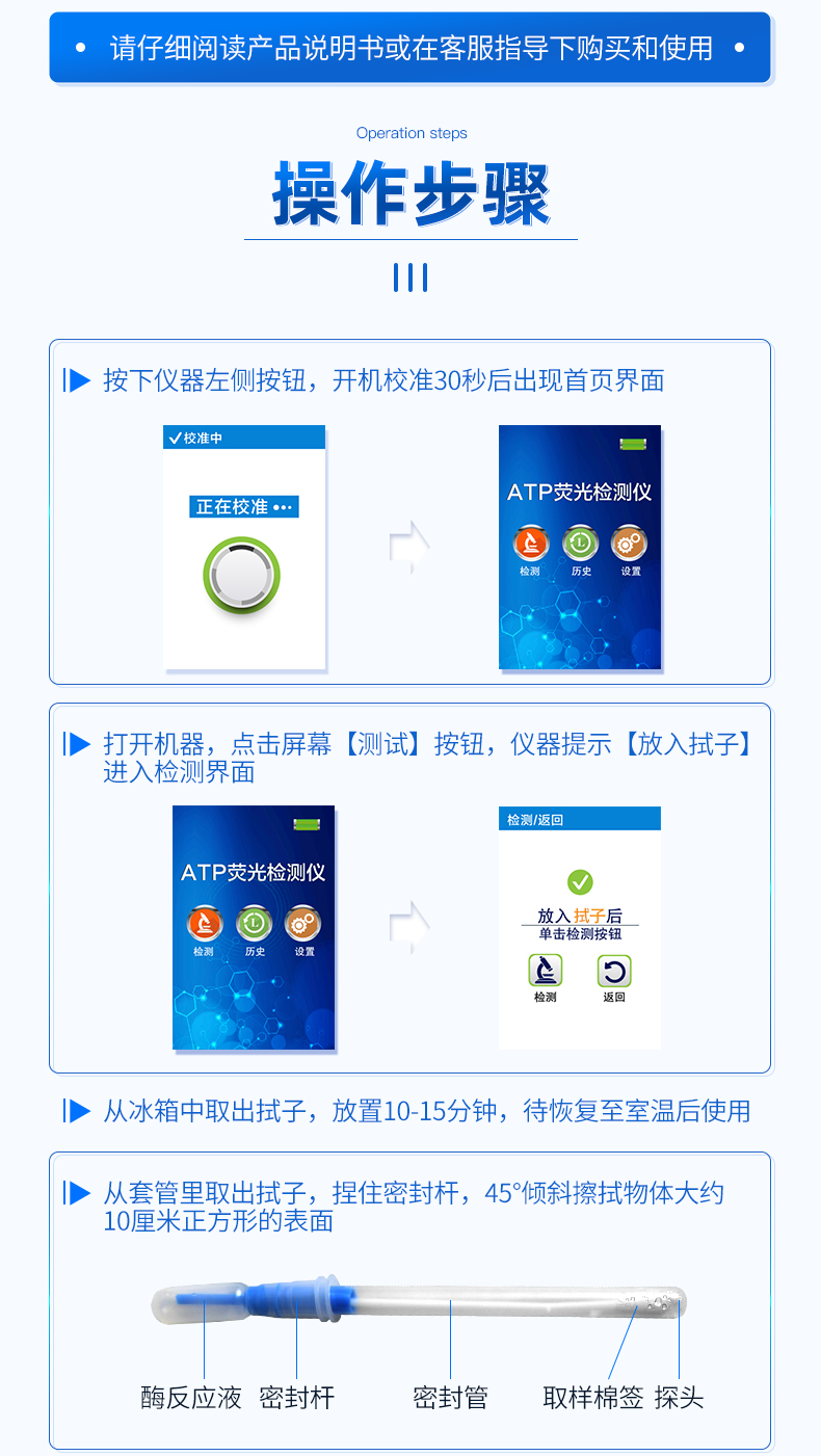 該設備為全新升級產品,大屏幕觸摸顯示屏,代替傳統按鍵。操作采用生物化學反應方法檢測ATP含量,ATP熒光檢測儀基于螢火蟲發光原理,利用“熒光素酶—熒光素體系”快速檢測三磷酸腺苷(ATP)。ATP拭子含有可以裂解細胞膜的試劑,能將細胞內ATP釋放出來,與試劑中含有的特異性酶發生反應,產生光,再用熒光照度計檢測發光值,微生物的數量與發光值成正比,由于所有生物活細胞中含有恒量的ATP,所以ATP含量可以清晰地表明樣品中微生物與其他生物殘余的多少,用于判斷衛生狀況。
