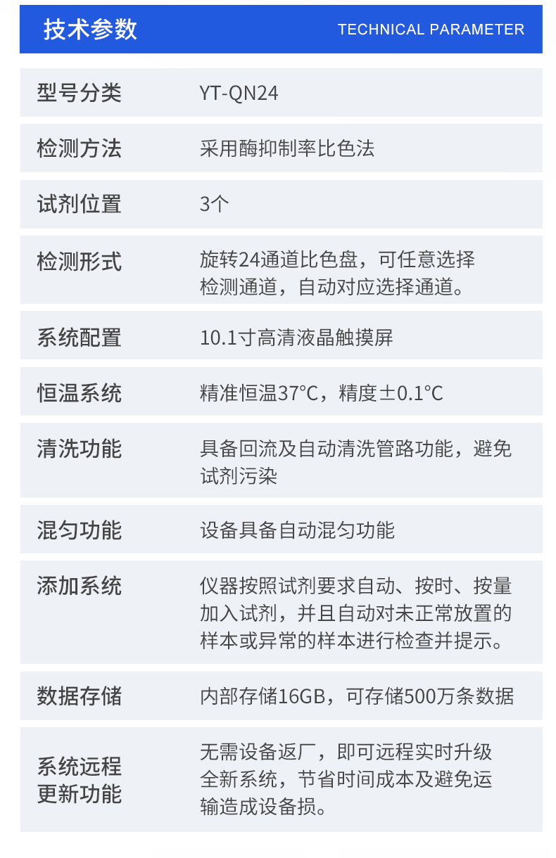 | 1. 試劑位置:3個(gè) | 2. 檢測(cè)形式:旋轉(zhuǎn)24通道比色盤,可任意選擇檢測(cè)通道,自動(dòng)對(duì)應(yīng)選擇通道。 | 3. 系統(tǒng)配置:10.1寸高清液晶觸摸屏,采用ARM Cortex?-A7,RK3288/4核處理器,運(yùn)行內(nèi)存1GB。Android7.1.1 系統(tǒng)分辨率1280×800。 | 4.恒溫系統(tǒng):具有自動(dòng)加溫溫控系統(tǒng),精準(zhǔn)恒溫37℃,精度±0.1℃。 | 5.添加系統(tǒng):儀器按照試劑要求自動(dòng)、按時(shí)、按量加入試劑,并且自動(dòng)對(duì)未正常放置的樣本或異常的樣本進(jìn)行檢查并提示。 | 6.清洗功能:儀器具備回流及自動(dòng)清洗管路功能,避免試劑污染。 | 7.混勻功能:設(shè)備具備自動(dòng)混勻功能。 | 8.光源校準(zhǔn):設(shè)備可自動(dòng)校準(zhǔn),確保檢測(cè)準(zhǔn)確度。 | 9.實(shí)時(shí)監(jiān)控:儀器測(cè)試過程中屏幕顯示運(yùn)行狀態(tài),可實(shí)時(shí)查看。 | 10.數(shù)據(jù)存儲(chǔ):內(nèi)部存儲(chǔ)16GB,可存儲(chǔ)500萬條數(shù)據(jù)。 | 11.樣品多選功能:設(shè)備具備樣品一鍵多選功能,選擇樣品自動(dòng)匹配檢測(cè)通道。 | 12.項(xiàng)目預(yù)設(shè):可提前設(shè)置單個(gè)及多個(gè)相同或不相同的檢測(cè)任務(wù),可單次或者多次調(diào)取,減少檢測(cè)時(shí)間。 | 13.自定義打印系統(tǒng):內(nèi)置自定義打印系統(tǒng),可按需靈活設(shè)置開啟或關(guān)閉:產(chǎn)品合格證(國家農(nóng)業(yè)部標(biāo)準(zhǔn)),二維碼,抽樣信息、檢測(cè)信息,受檢信息等信息的打印。 | 14.A4版本報(bào)告打印功能:設(shè)備可自動(dòng)生成A4版報(bào)告,A4報(bào)告帶二維碼,可掃描二維碼生成電子版,并可識(shí)別真?zhèn)巍?/td> | 15.傳輸方式:儀器配備無線通信模塊: 4G(APN)通訊模塊、Wifi模塊,藍(lán)牙傳輸模塊,同時(shí)具有USB接口以及RJ45接口能以多種方式實(shí)現(xiàn)數(shù)據(jù)保存和數(shù)據(jù)傳輸功能,設(shè)備數(shù)據(jù)可以同步上傳至平臺(tái)。 | 16.數(shù)據(jù)監(jiān)管系統(tǒng):設(shè)備自帶監(jiān)管平臺(tái),并可同步對(duì)接監(jiān)管平臺(tái),數(shù)據(jù)可局域網(wǎng)和互聯(lián)網(wǎng)數(shù)據(jù)上傳,檢測(cè)結(jié)果可直接傳至食品安全監(jiān)管平臺(tái)。達(dá)到食品安全問題預(yù)估、預(yù)警。 | 17.系統(tǒng)遠(yuǎn)程更新功能:無需設(shè)備返廠,即可遠(yuǎn)程實(shí)時(shí)升級(jí)全新系統(tǒng),節(jié)省時(shí)間成本及避免運(yùn)輸造成設(shè)備損。 |