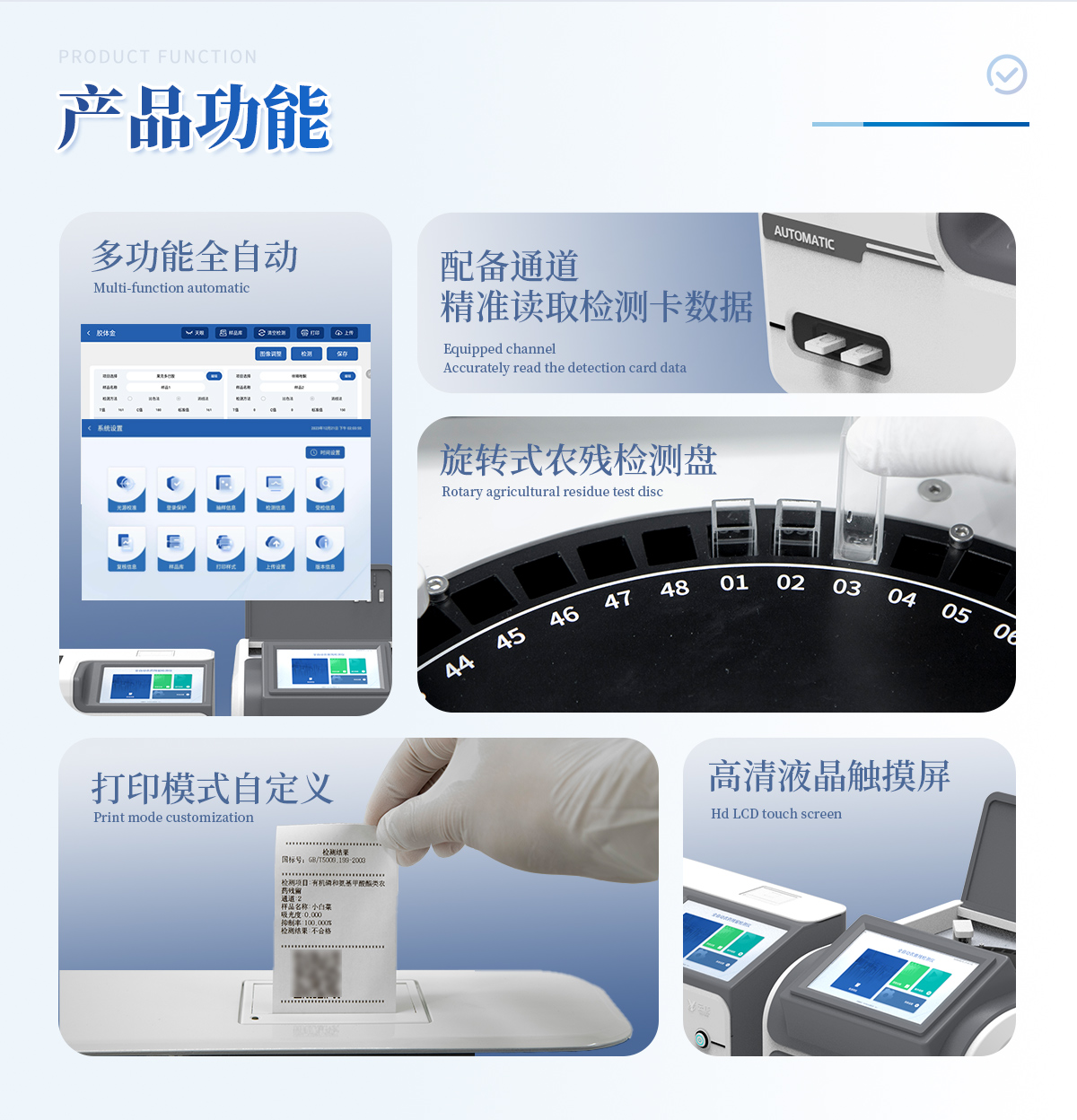 | 1. 試劑位置:3個 | 2. 農殘檢測盤:旋轉24通道比色盤,可任意選擇檢測通道,自動對應選擇通道。 | 3. 膠體金通道:2個,可讀取檢測卡結果,自動采集、處理分析,自動判斷檢測結果,并具備自動判空功能。 | 4.系統配置:10.1寸高清液晶觸摸屏,采用ARM Cortex?-A7,RK3288/4核處理器,運行內存1GB。Android7.1.1 系統分辨率1280×800。 | 5.恒溫系統:具有自動加溫溫控系統,精準恒溫37℃,精度±0.1℃。 | 6.添加系統:儀器按照試劑要求自動、按時、按量加入試劑,并且自動對未正常放置的樣本或異常的樣本進行檢查并提示。 | 7.清洗功能:儀器具備回流及自動清洗管路功能,避免試劑污染。 | 8.混勻功能:設備具備自動混勻功能。 | 9.光源校準:設備可自動校準,確保檢測準確度。 | 10.實時監控:儀器測試過程中屏幕顯示運行狀態,可實時查看。 | 11.數據存儲:內部存儲16GB,可存儲500萬條數據。 | 12.樣品多選功能:設備具備樣品一鍵多選功能,選擇樣品自動匹配檢測通道。 | 13.項目預設:可提前設置單個及多個相同或不相同的檢測任務,可單次或者多次調取,減少檢測時間。 | 14.自定義打印系統:內置自定義打印系統,可按需靈活設置開啟或關閉:產品合格證(國家農業部標準),二維碼,抽樣信息、檢測信息,受檢信息等信息的打印。 | 15.A4版本報告打印功能:設備可自動生成A4版報告,A4報告帶二維碼,可掃描二維碼生成電子版,并可識別真偽。 | 16.傳輸方式:儀器配備無線通信模塊: 4G(APN)通訊模塊、Wifi模塊,藍牙傳輸模塊,同時具有USB接口以及RJ45接口能以多種方式實現數據保存和數據傳輸功能,設備數據可以同步上傳至平臺。 | 17.系統17.數據監管系統:設備自帶監管平臺,并可同步對接監管平臺,數據可局域網和互聯網數據上傳,檢測結果可直接傳至食品安全監管平臺。達到食品安全問題預估、預警。 | 18.系統遠程更新功能:無需設備返廠,即可遠程實時升級全新系統,節省時間成本及避免運輸造成設備損。 |