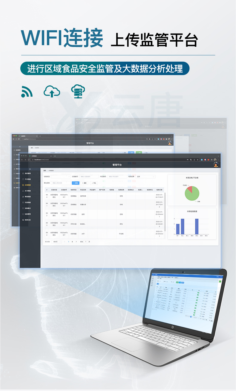 9.6、數(shù)據(jù)監(jiān)管系統(tǒng):同步對接監(jiān)管平臺,數(shù)據(jù)可局域網(wǎng)和互聯(lián)網(wǎng)數(shù)據(jù)上傳,檢測結(jié)果可直接傳至食品安全監(jiān)管平臺。進行區(qū)域食品安全監(jiān)管及大數(shù)據(jù)分析處理與數(shù)據(jù)統(tǒng)計,監(jiān)測區(qū)域食品安全長短期動態(tài)及問題預估、預警。