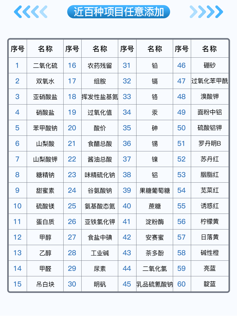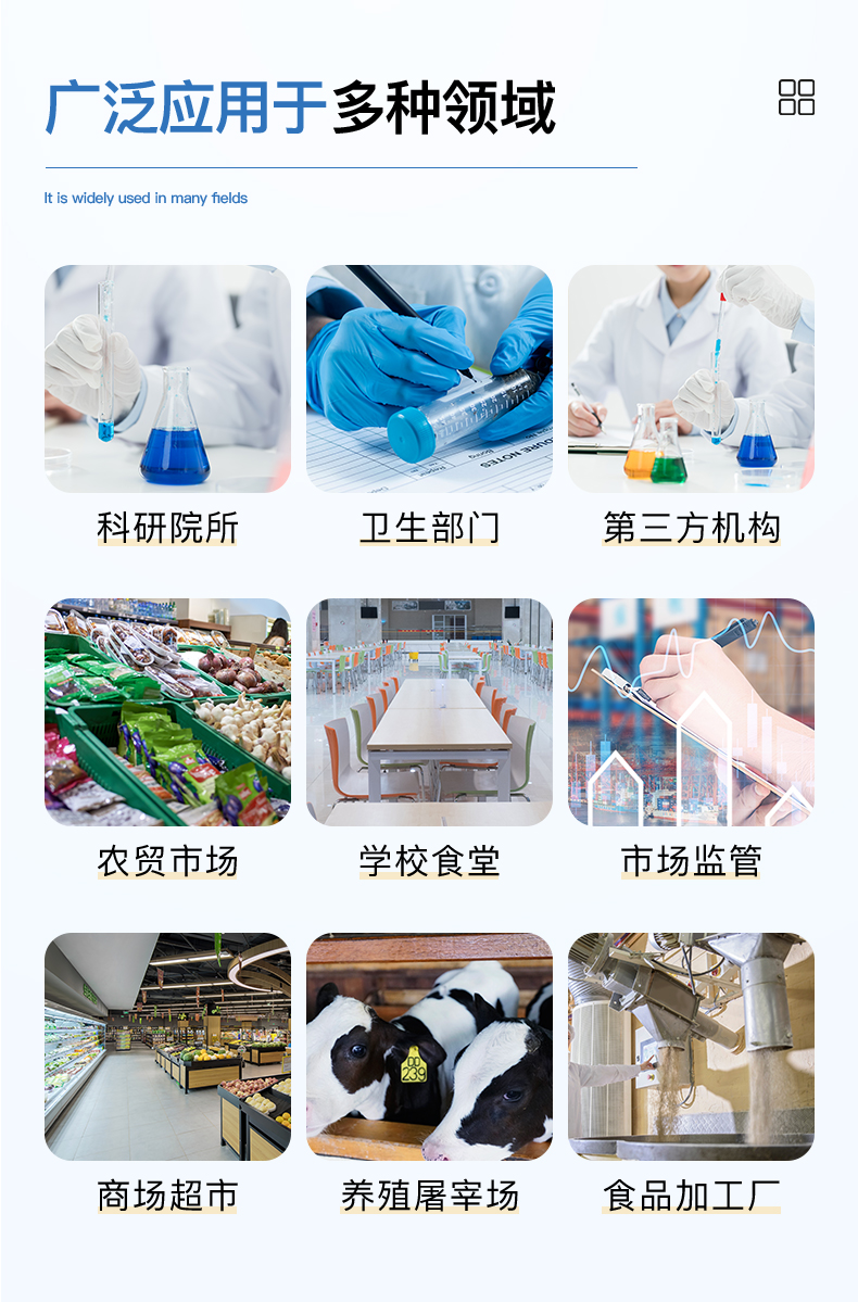 3、瓜果蔬菜藥殘:農藥殘留(酶抑制率法)、多菌靈、百菌清、毒死蜱、克百威、啶蟲脒、甲萘威、甲氰菊酯、異丙威、氟蟲腈、聯苯菊酯、阿維菌素、噻蟲嗪、吡蟲啉、殺螟硫磷、百草枯、無根水(豆芽)、6-芐氨基嘌呤(豆芽)等;