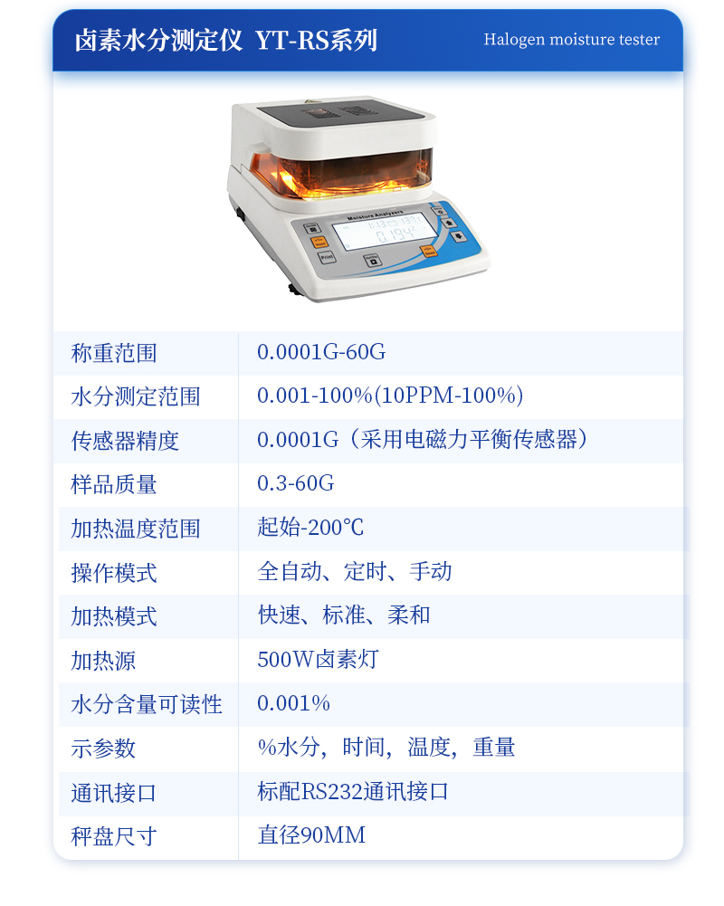 先咨詢優(yōu)惠福利,再購(gòu)買,價(jià)格更便宜,更實(shí)惠。 在線咨詢 技術(shù)問(wèn)題鹵素水分測(cè)定儀是我公司新研制的新型快速水分檢測(cè)儀器。鹵素水分測(cè)定儀采用國(guó)際***的稱重系統(tǒng)【電磁平衡傳感器】。其特點(diǎn)是稱量準(zhǔn)確可靠、顯示快速清晰并且具有自動(dòng)檢測(cè)系統(tǒng)、簡(jiǎn)便的自動(dòng)校準(zhǔn)裝置以及超載保護(hù)等裝置。是一種新型快速的水分檢測(cè)儀器。