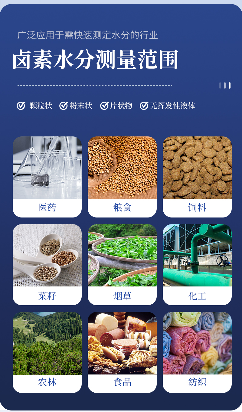 可廣泛應(yīng)用于一切需要快速測(cè)定水分的行業(yè),如醫(yī)藥,糧食、飼料、種子,菜籽,脫水蔬菜、煙草,化工,茶葉,食品、肉類以及紡織,農(nóng)林、造紙、橡膠、塑膠、紡織等行業(yè)中的實(shí)驗(yàn)室與生產(chǎn)過(guò)程中。同時(shí)滿足固體、顆粒、粉末、膠狀體及液體含水率的測(cè)定要求