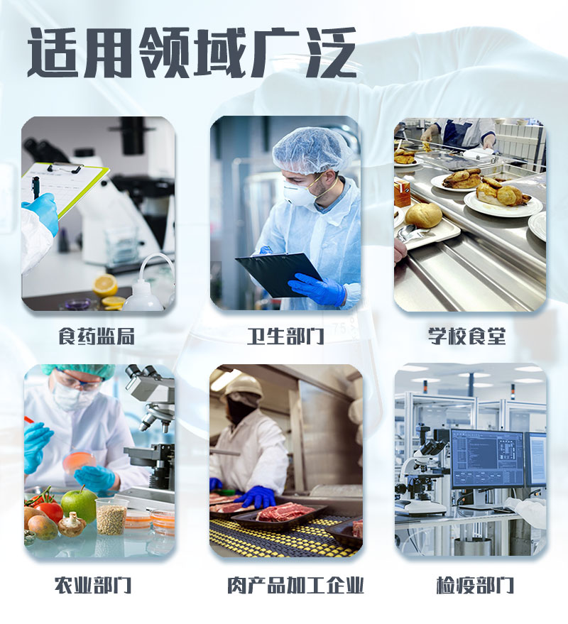 該多功能食品安全檢測儀為集成一體化食品安全快速檢測分析設備,廣泛應用于食藥監局、衛生部門、高教院校、科研院所、農業部門、養殖場、屠宰場、食品肉產品深加工企業、檢驗檢疫部門等單位使用。