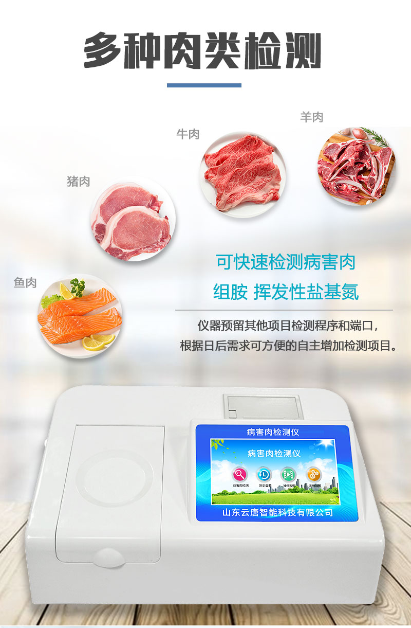 可快速檢測病害肉、組胺、揮發性鹽基氮,儀器預留其他項目檢測程序和端口,根據日后需求可方便的自主增加檢測項目。